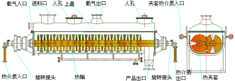空心軸上密集排列著楔型中空槳葉,熱介質(zhì)經(jīng)空心軸流經(jīng)槳葉。單位有效容積內(nèi)傳熱面積很大,熱介質(zhì)溫度從-40℃到320℃,可以是水蒸汽,也可以是液體介質(zhì):如冰鹽水、熱水、導(dǎo)熱油等。間接傳導(dǎo)加熱,熱量主要用來加熱物料,使用極少量空氣帶走濕氣,熱量損失僅為通過器體保溫層向環(huán)境的散熱,以及少量尾氣攜帶的熱量。相互齒合的楔型槳葉之間具有互相清潔功能;而物料顆粒與楔型面的相對(duì)運(yùn)動(dòng)產(chǎn)生洗刷作用,能夠洗刷掉楔型面上附著物料,使運(yùn)轉(zhuǎn)中一直保持著清潔的傳熱面。